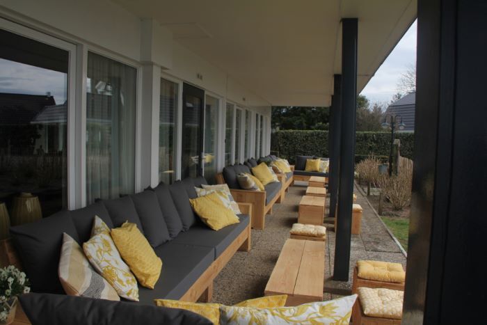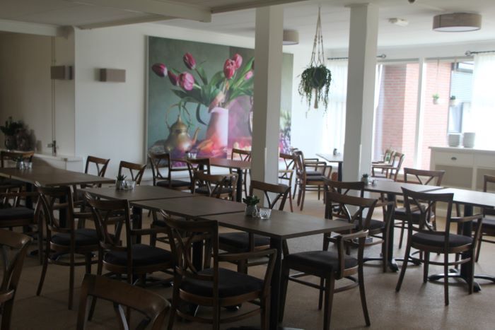 Vanuit de ruime woonkamer loopt u onze tuin in en kijkt u uit op de weilanden, de koeien zijn uw nieuwe buren. De woonkamer is gezellig ingericht met hoge en lage zitjes en een gezellig barretje. Een kaartje leggen, puzzel maken, TV kijken, lezen of met z’n allen een spelletje doen, er is ruimte voor iedereen.