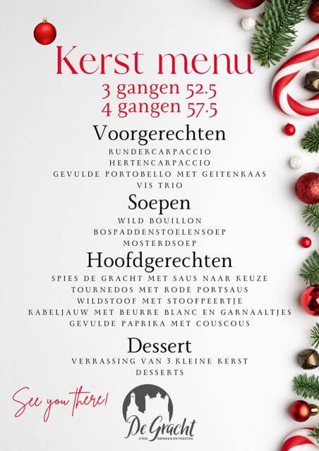 Voor wie een avond vol culinaire verwennerij zoekt, heeft De Gracht een speciaal Kerst Menu samengesteld. Je hebt de keuze uit drie gangen voor €52,50 of vier gangen voor slechts €57,50. Het menu is zorgvuldig ontworpen om voor elk wat wils te bieden.