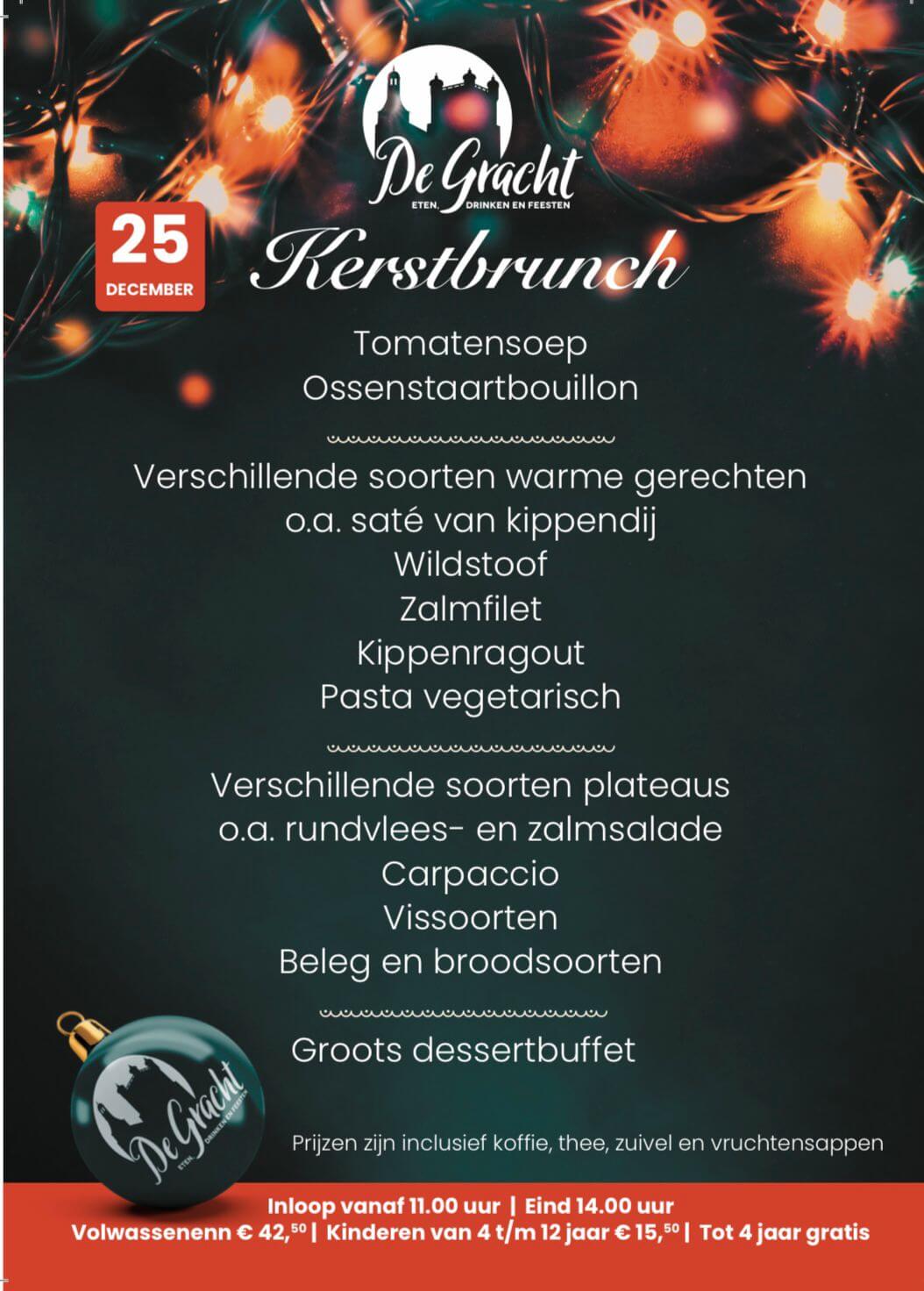 Voor wie liever overdag geniet van heerlijk eten, biedt De Gracht op Eerste Kerstdag een uitgebreide Kerst Brunch. Vanaf 11:00 uur ben je welkom om aan te schuiven en te genieten van een brunch die geschikt is voor jong en oud.
