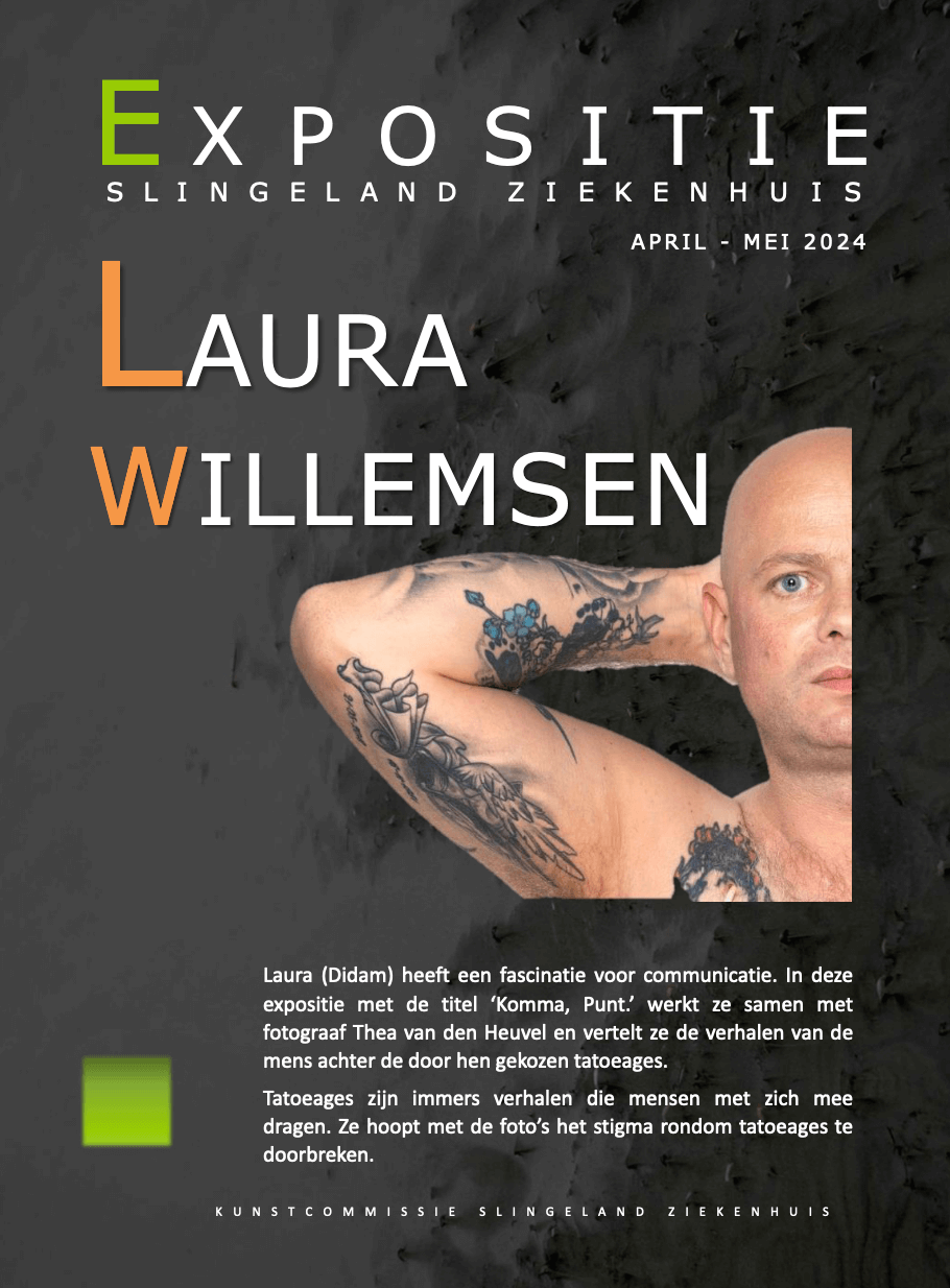 Laura (Didam) heeft een fascinatie voor communicatie, dit loopt als een rode draad door haar leven en uit zich o.a. in deze expositie met de titel ‘Komma, Punt’. In samenwerking met fotograaf Thea van den Heuvel vertelt ze de verhalen achter de mens en de door hen gekozen tatoeages. Tatoeages zijn immers verhalen die mensen met zich mee dragen en ze hoopt met deze foto’s de stigma’s rondom tatoeages te doorbreken. Ze is een creatieve allrounder die vaak de grenzen opzoekt.