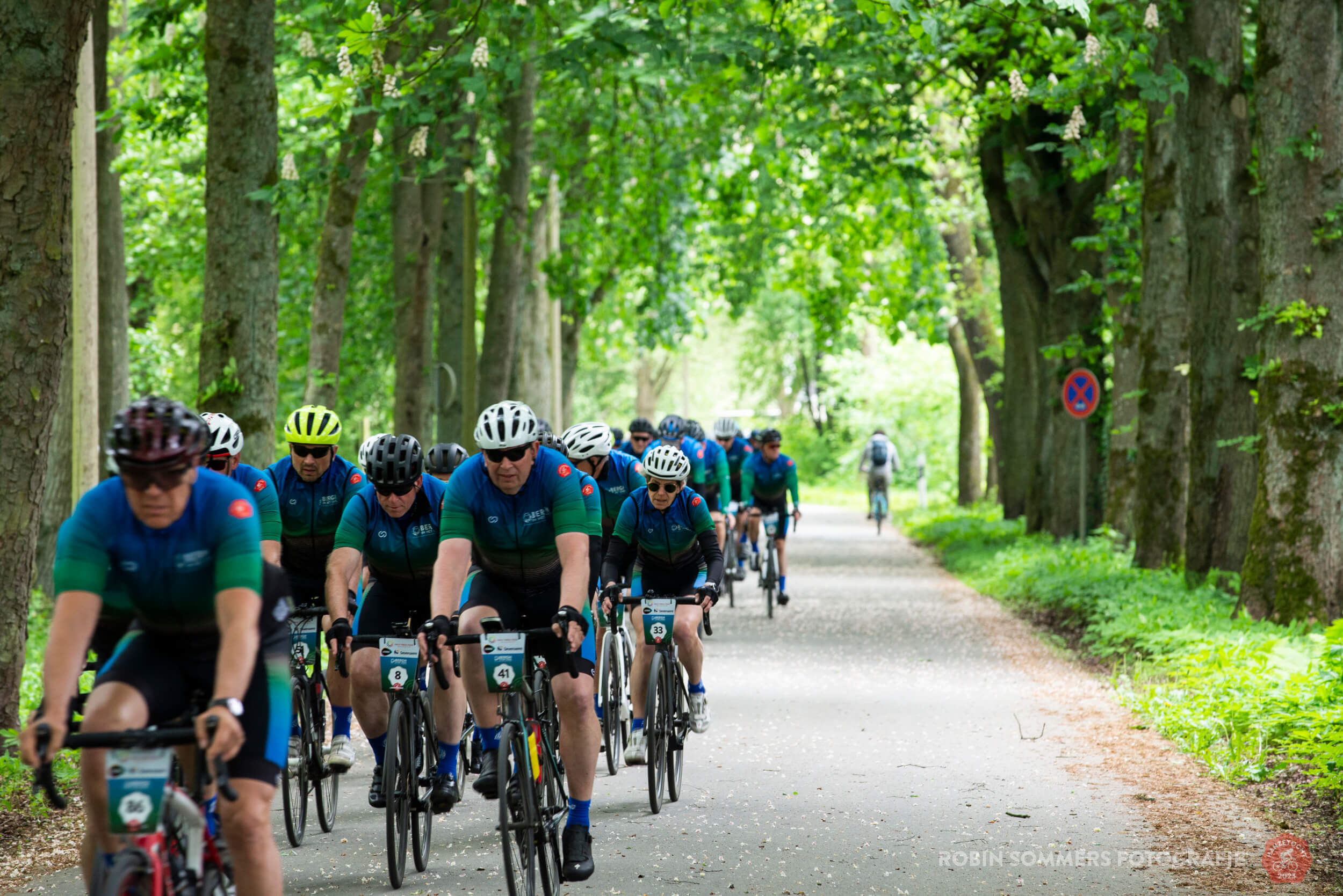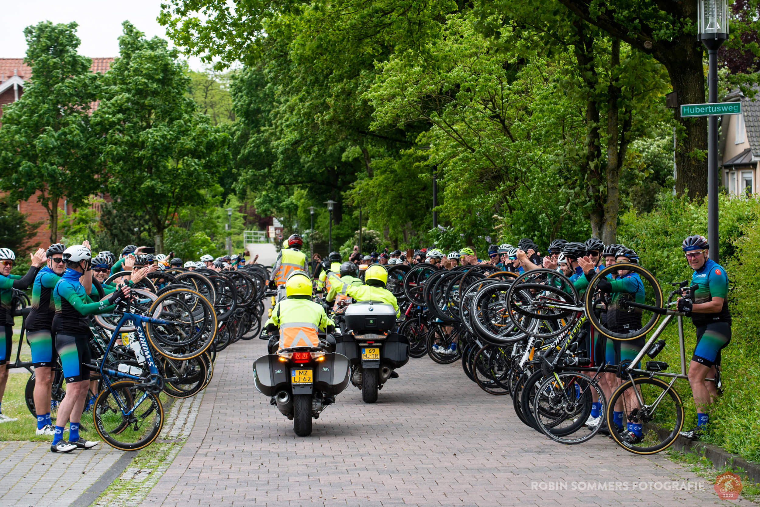 Een grote groep ‘bikkels’ renners staat klaar voor de start van de Hanzetocht 2023.