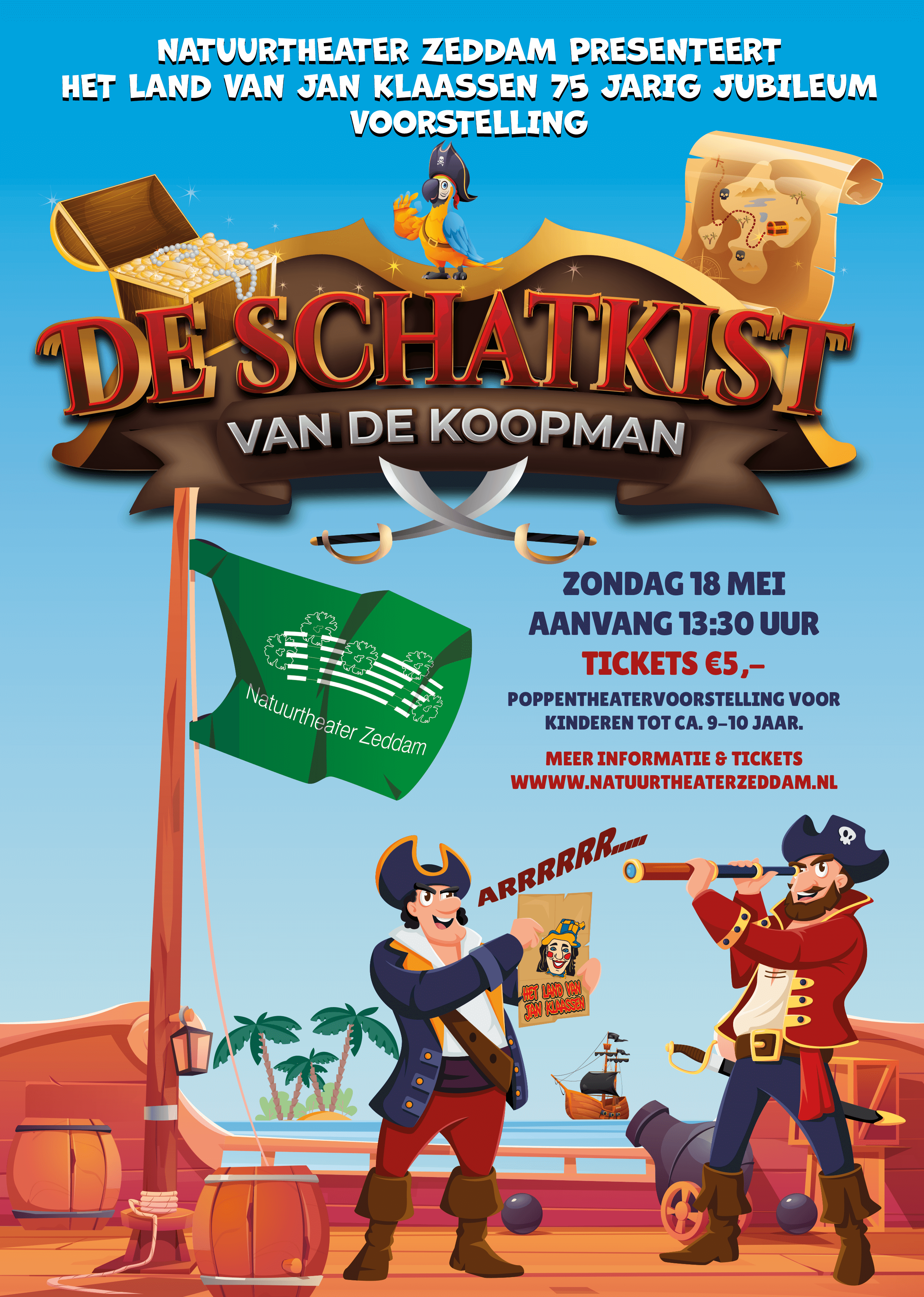Dit jaar bestaat het poppentheater van Jan Klaassen maar liefst 75 jaar – en dat wordt gevierd met een feestelijke voorstelling in de buitenlucht! Op zondag 18 mei om 13.30 uur speelt Geert Prein samen met zijn medespelers de interactieve voorstelling “De schatkist van de koopman” in het sfeervolle Natuurtheater Zeddam. Speciaal voor kinderen tot ongeveer 10 jaar – maar stiekem net zo leuk voor (groot)ouders!