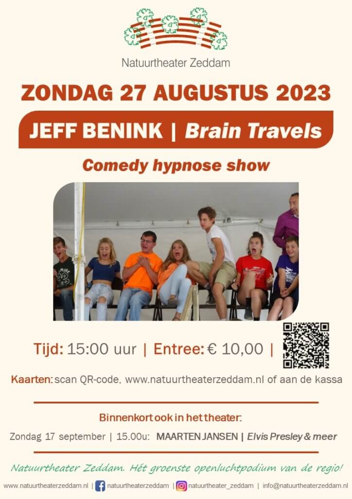 Internationaal hypnotiseur Jeff Benink traint je lachspieren met zijn Comedy Hypnosis Show. Alles gebeurt echt, er zijn GEEN acteurs. Jij bent zondagmiddag 27 augustus om 15.00 in Natuurtheater Zeddam de ster van de show . Bekijk de show of wees je de show?
