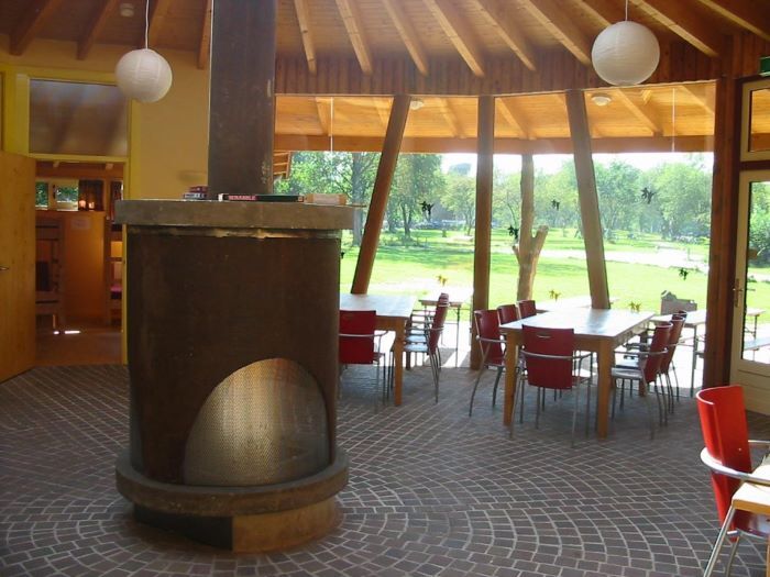 In het midden van de centrale ruimte staat een open haard voor een gezellig samenzijn. Er is de mogelijkheid om volledig en verzorgd ontbijt, lunch en diner te bestellen. ’s Avonds kan er na gekletst worden in de buitenlucht bij de kampvuurplaats.
