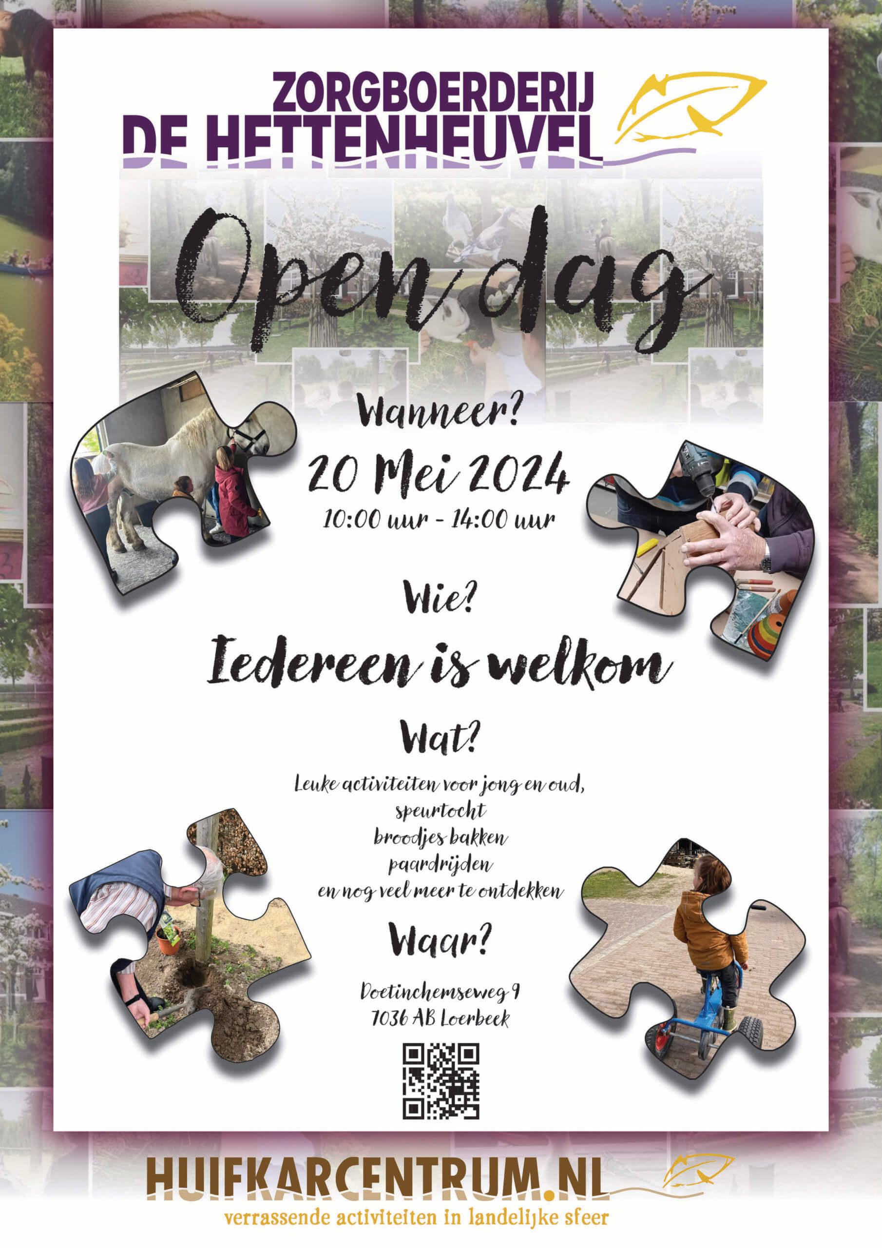 20 mei 2024 organiseert Zorgboerderij de Hettenheuvel een open dag voor jong en oud. Iedereen is deze dag vanaf 10:00 uur van harte welkom. De dag duurt tot een uurtje of 14:00.