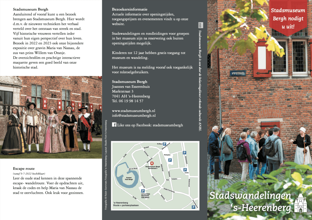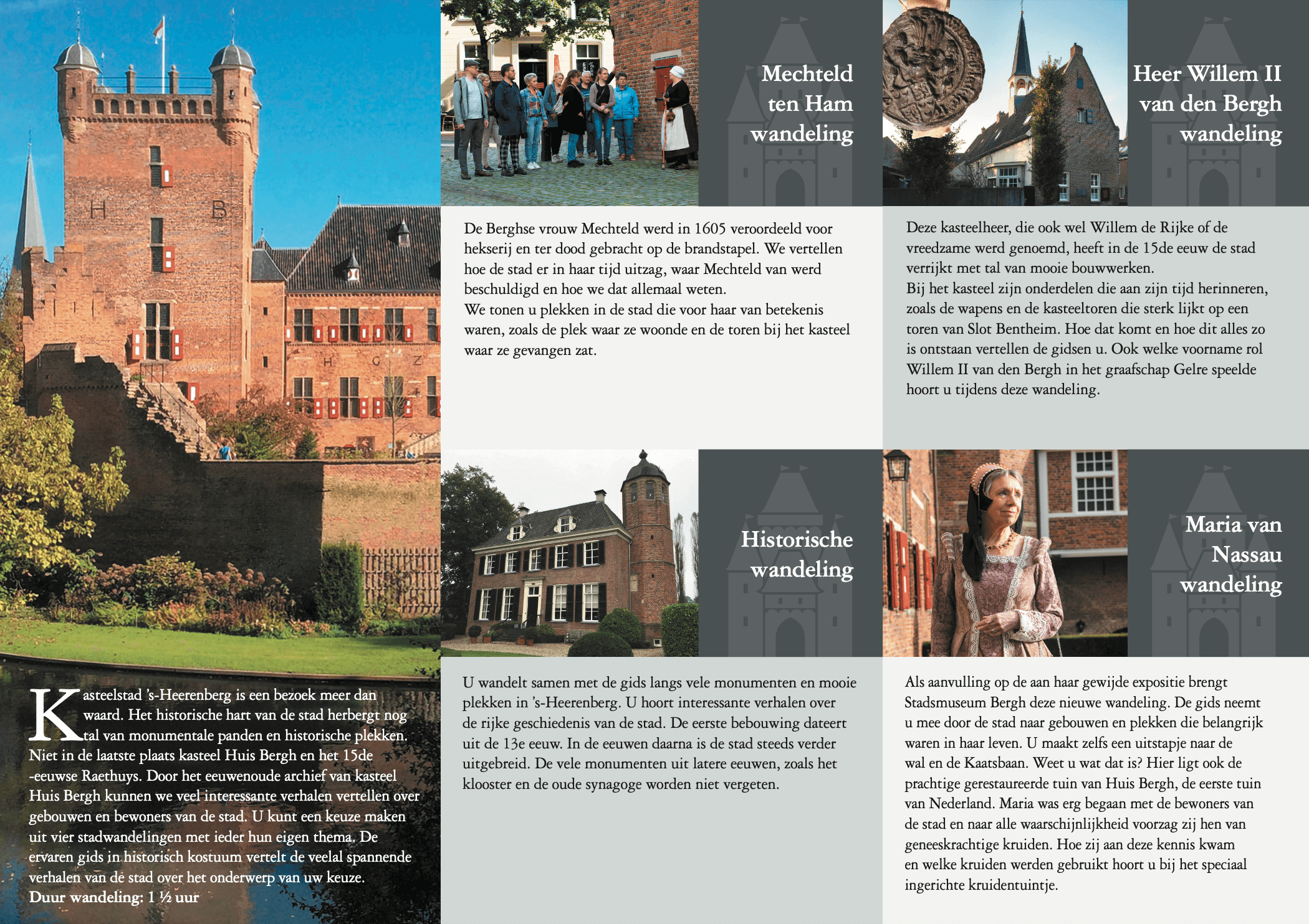 Samen met een ervaren gids in historische kleding wandelt u in 1 a 1,5 uur langs vele monumenten en mooie plekken in het oude ‘s-Heerenberg. U hoort interessante verhalen over de rijke geschiedenis van de stad. Waar woonde de vermeende heks Mechteld ten Ham en hoe en waar werd ze gevangen gehouden en veroordeeld. Of wandel via de wal langs de eerste tuin van Nederland, waar Maria van Nassau haar kruidentuin had.