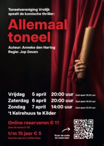 Uitvoeringen zijn op: vrijdagavond 5, zaterdagavond 6 en zondagmiddag 7 april in het Kelrehuus te Kilder.