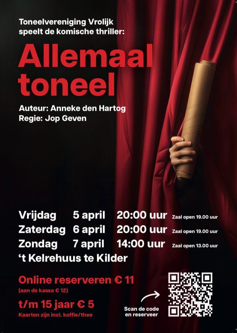 Kaarten zijn nu te bestellen a € 11,00 (incl. koffie of thee) via facebook “Toneelvereniging Vrolijk” of bij de kassa voor €12,00.