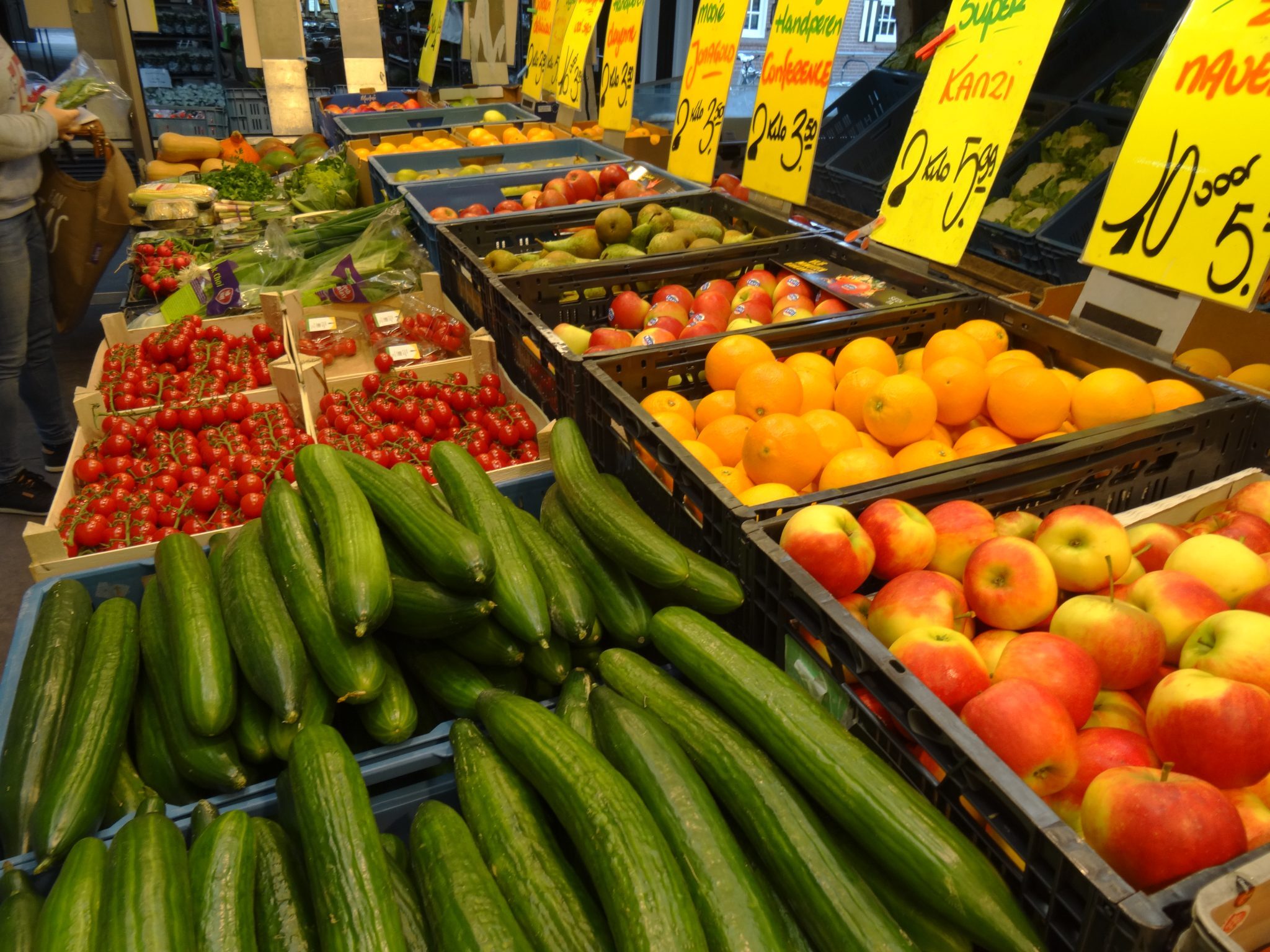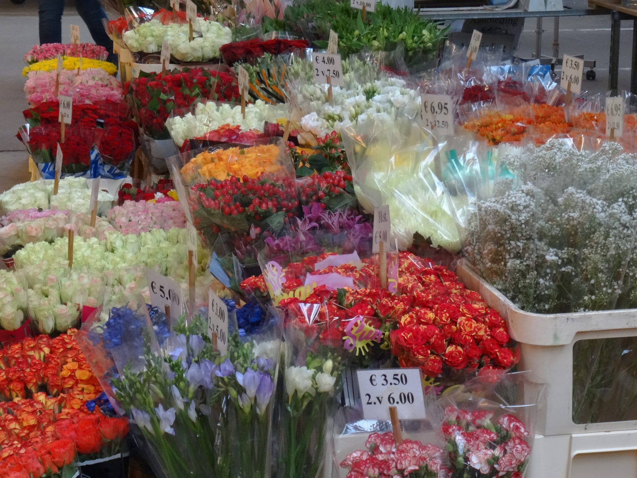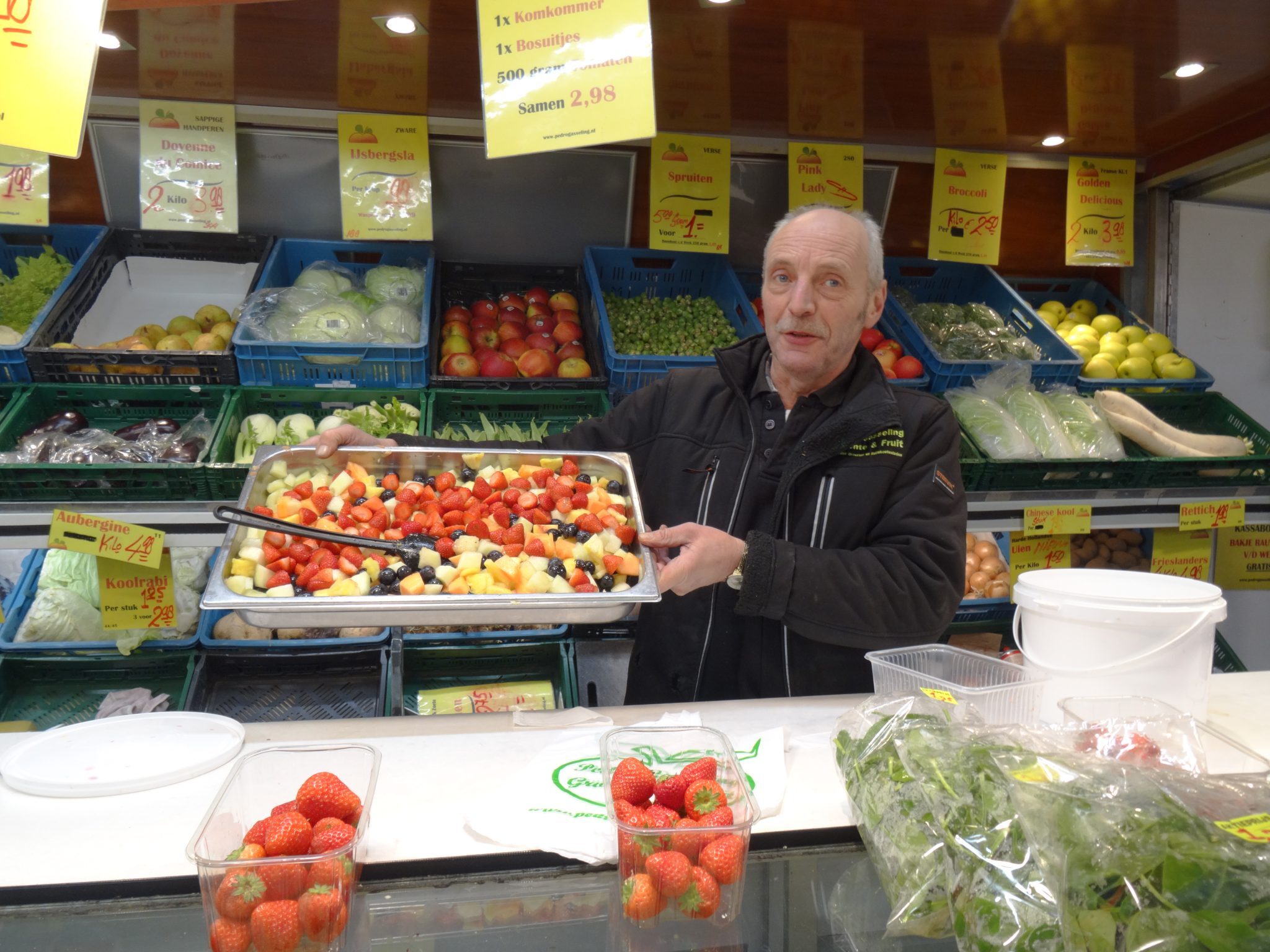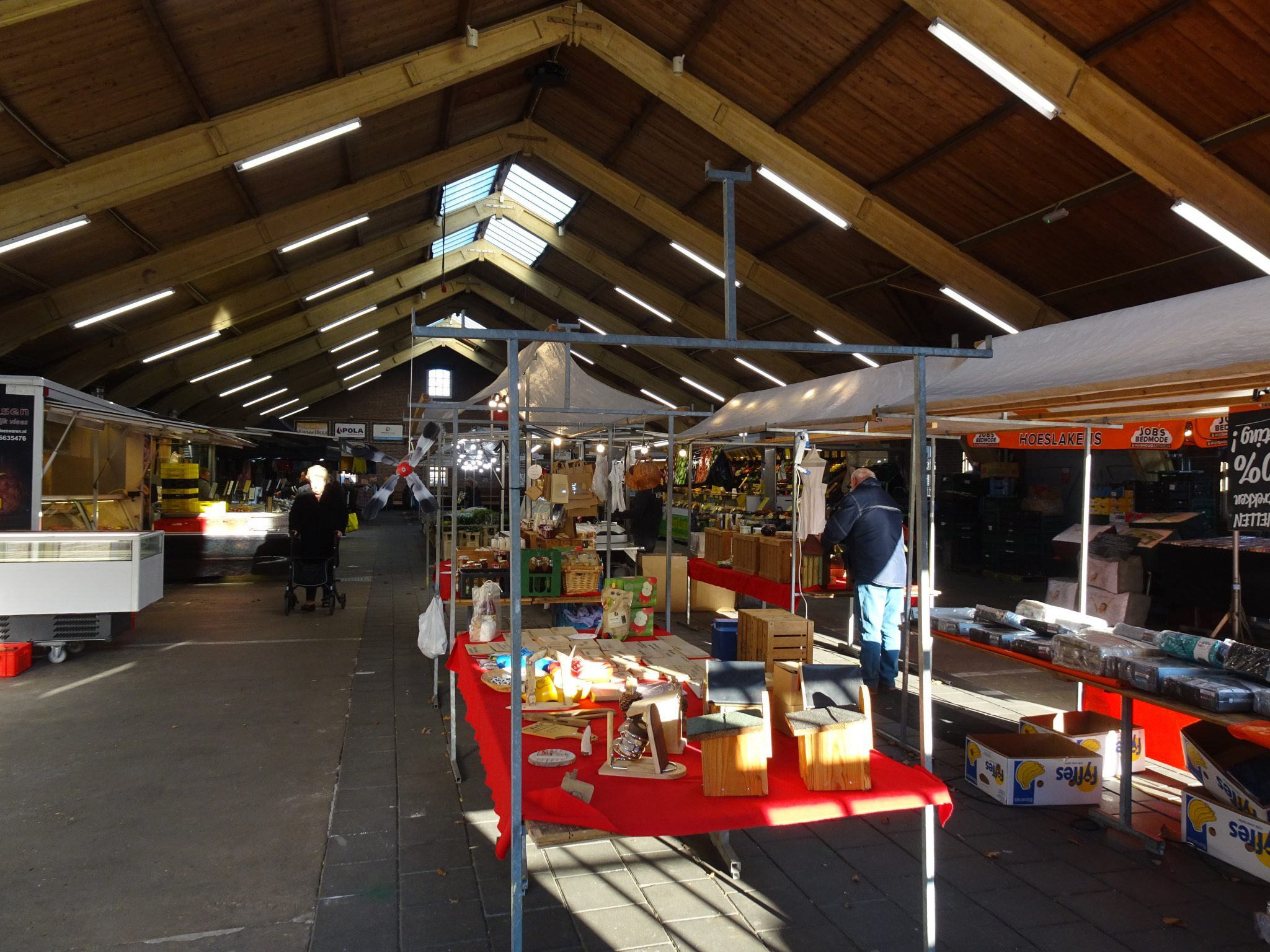 Een complete food- en non foodmarkt met vis, brood, kaas, vlees, bloemen, poelier, groente, noten, snoep, loempia, lederwaren, dierenbenodigdheden, ondergoed, beddengoed, natuurproducten, olijven.